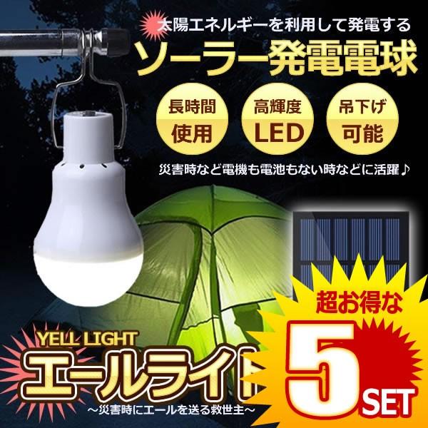 5個セット ソーラーライト エールライト 太陽光 発電パネル付 吊り下げフック付 非常用 携帯可能 照明 電源不要 電気代 ゼロ ソーラー電球 LED電球 ランプ ポータブル防災 災害 YELLIGHT