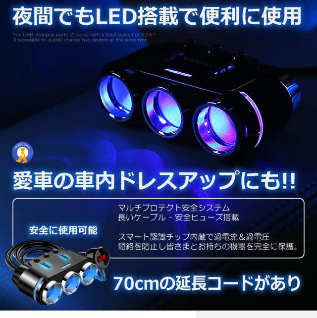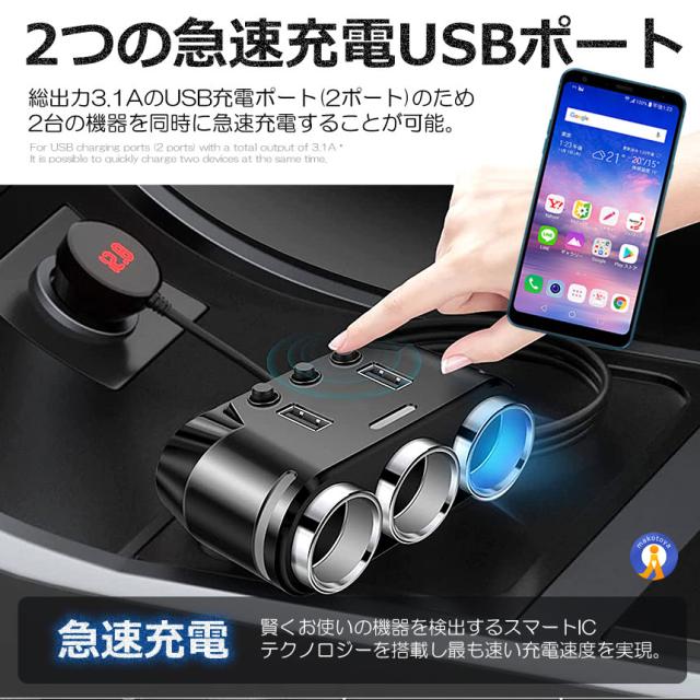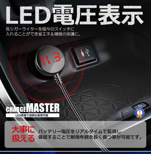 シガー増設 シガーアダプタ 12V 24V 対応 急速充電 USB 2ポート 電圧計付き LED電圧表示 ドラレコ 充電器 充電 車載 カー用品 シガーチャージャー CIGAMAST