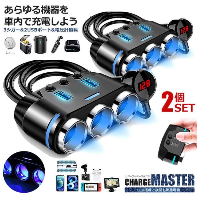 2個セット シガー増設 シガーアダプタ 12V 24V 対応 急速充電 USB 2ポート 電圧計付き LED電圧表示 ドラレコ 充電器 充電 車載 カー用品 シガーチャージャー CIGAMAST