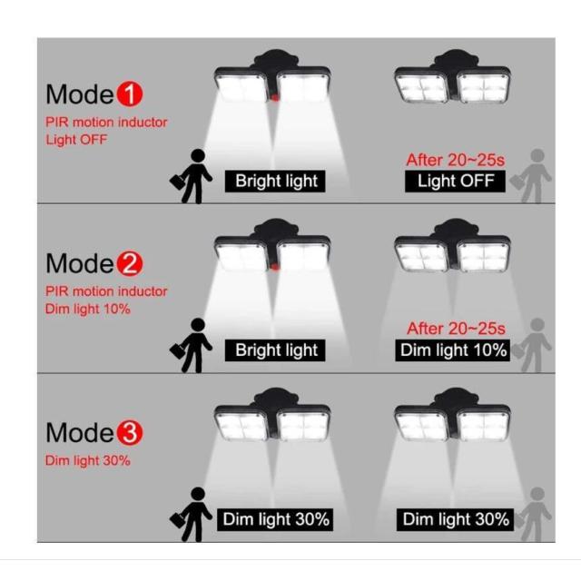 モード2:弱光で点灯。センサーが感知すると強光で点灯、動きを感知しなくなると20〜25秒で弱光