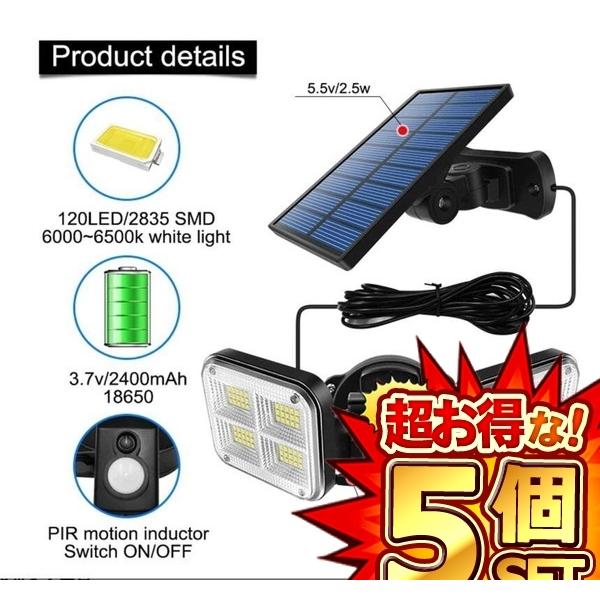 5個セット ソーラーセンサーライト LED 分離型 5mコード付き 120LED 人感センサー 3つの点灯モード モーションセンサー 屋外 夜間自動点灯 取り付けパーツ付属 簡単操作 FENTI120LED