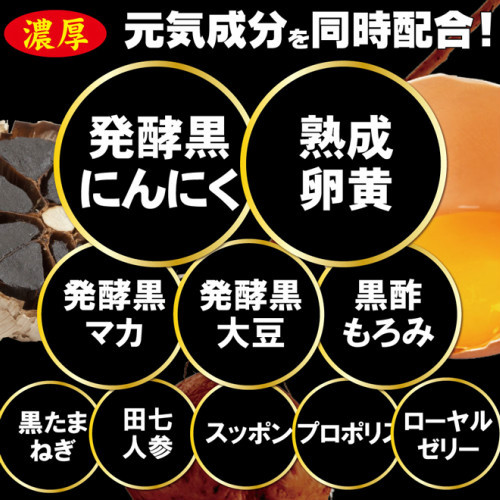 | 原材料名 | 醗酵黒ニンニク末、田七人参、すっぽん粉末、黒マカエキス、香醋粉末(香醋、デキストリン)、卵黄ペプチド(卵を含む)、黒大豆種皮エキス末(大豆を含む)、醗酵黒タマネギ末、もろみ黒酢末、乳酸菌(乳酸菌殺菌菌体、デキストリン)(乳成分を含む)、ローヤルゼリー、プロポリス抽出物 / セルロース、クエン酸、ステアリン酸カルシウム、ビタミンB1 |