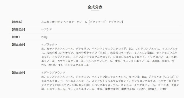 水、セテアリルアルコール、グリセリン、ベヘントリモニウムクロリド、BG、リシリコンブエキス、マコンブエキス、加水分解コンキオリン、加水分解ケラチン(羊毛)、水溶性コラーゲン、ヒアルロン酸Na、セトリモニウムクロリド、アモジメチコン、ステアルトリモニウムクロリド、ジココジモニウムクロリド、イソプロパノール、乳酸、エタノール、カプリリルグリコール、1,2-ヘキサンジオール、香料、フェノキシエタノール、黒401、紫401、橙205、赤106、青1、ベンジルアルコール ※ダークブラウン※ 水、ミリスチルアルコール、ジメチコン、パルミチン酸エチルヘキシル、ヒマシ油、BG、ジアルキル(C12-18)ジモニウムクロリド、ベヘニルアルコール、ステアルトリモニウムブロミド、リシリコンブエキス、ヘキサ(ヒドロキシステアリン酸/ステアリン酸/ロジン酸)ジペンタエリスリチル、オレス-2、イソプロパノール、ダイズ油、クエン酸、トコフェロール、フェノキシエタノール、香料、塩基性青99、塩基性茶16、HC赤3、HC青2、HC黄2 |