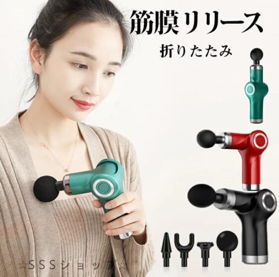 筋膜リリース 折りたたみ式 USB充電 電動マッサージ器 4種類ヘッド 4段階調節可能 強力振動 超軽量 コンパクト マッサージガン