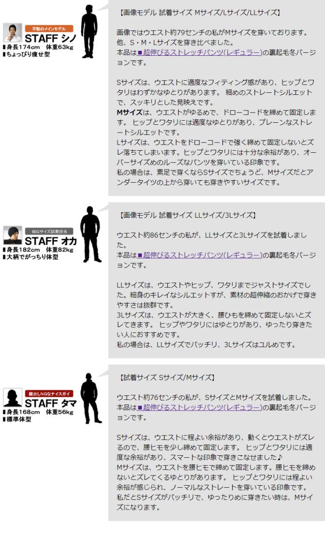 サイズ感は■超伸びるストレッチパンツ■の レギュラーシルエットとほぼ同じくらいで、裏起毛のやや厚手の仕様です。