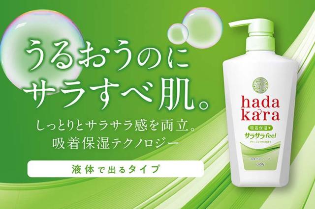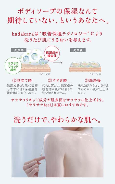 吸着保湿テクノロジーで保湿成分が洗い流されないボディソープ「ハダカラ」のサラサラfeelタイプ。