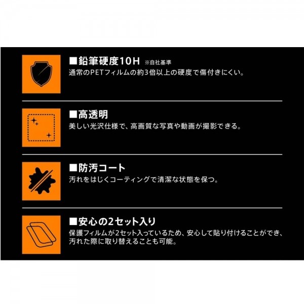 | 商品の説明 | 表面硬度10Hでカメラレンズを傷から護る 通常のPETフィルムの約3倍以上の硬度で傷付きにくい 美しい光沢仕様で、高画質な写真や動画が綺麗に撮影できる 汚れをはじくコーティングで清潔な状態を保つ 保護フィルムが2セット入っているため、安心して貼り付けることができ、汚れた際に取り替えることも可能 |