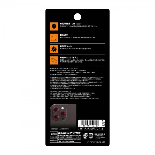 | 主な仕様 | 対応機種: iPhone 14 Pro Max/14 Pro メーカー製品型番: RT-P3739FT/CA12 素材: シリコン膜(カメラレンズ保護フィルム吸着面)、アクリル系樹脂+PET(カメラレンズ保護フィルム表面) |