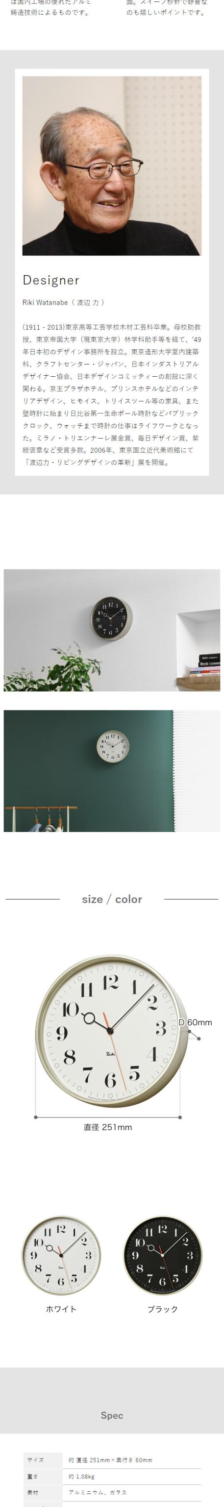 プロダクトデザインの巨匠、渡辺力が手がけた掛け時計。メガネ針とリンクする円形のインデックスや赤い秒針等、シンプルな中に工夫が盛り込まれた高級感のある落ち着いたデザインです。