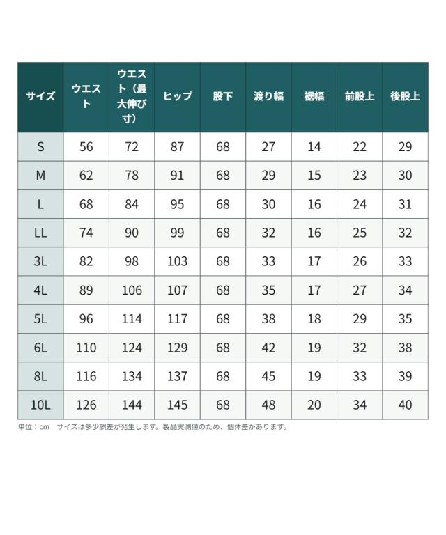 品質=レーヨン71%・ナイロン25%・ポリウレタン4% ウエスト総ゴム・ひも入 ポケット前2つ後2つ 原産国:カンボジア・中国製 備考:※仕立てサイズとは、実際に商品を測った時のサイズのことです。単位:cm ※サイズの誤差は多少発生します。ご了承ください。※ウエストはゴムを縮めた状態での表示となります。ウエストの最大伸び寸法は表示寸法+約17cmです。