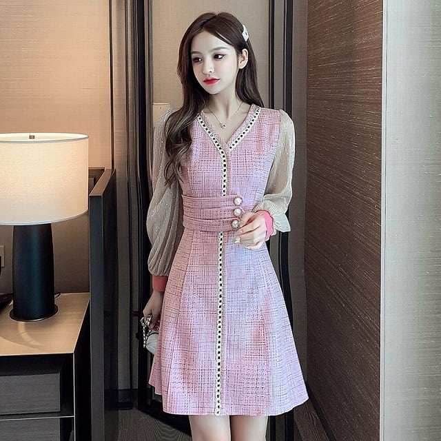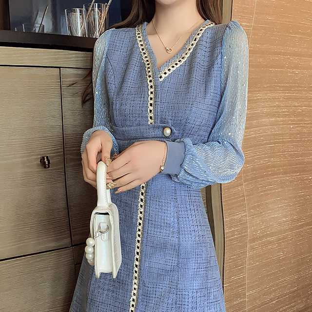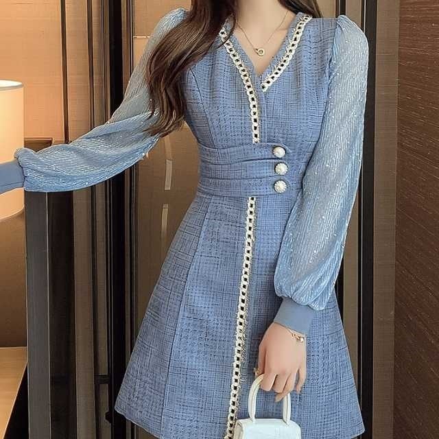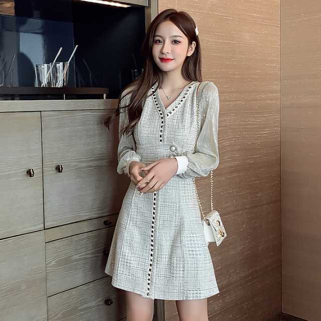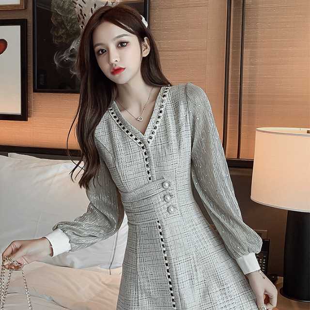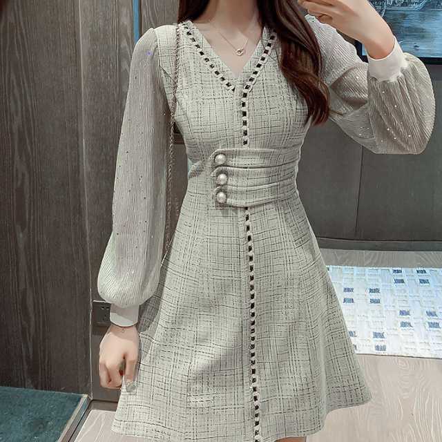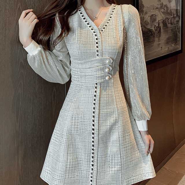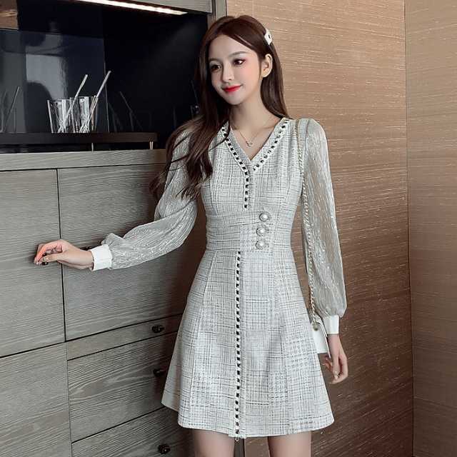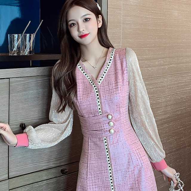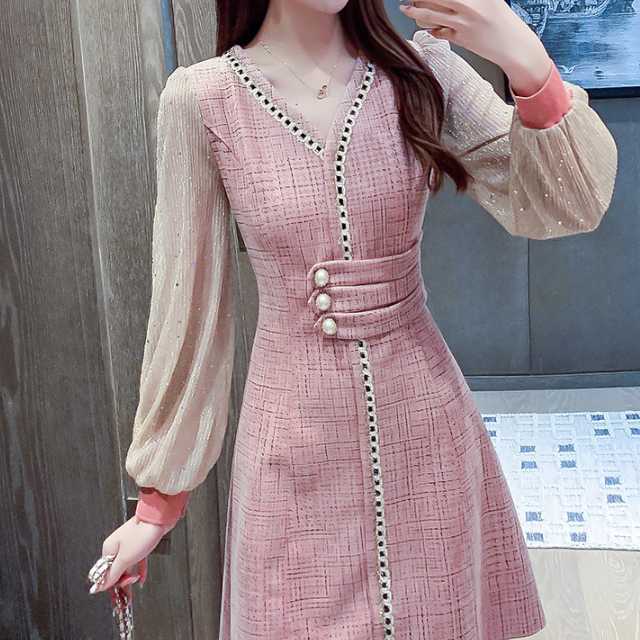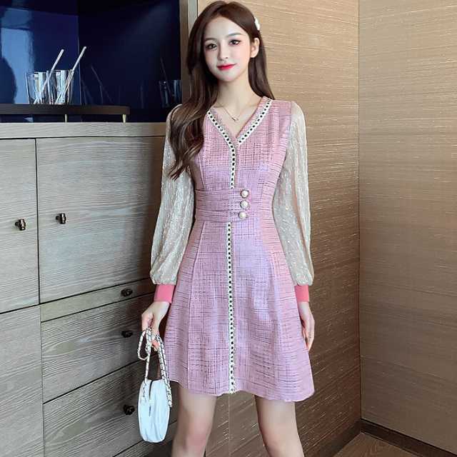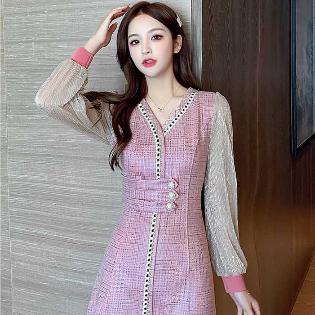 ドレス ワンピース レース シフォン パーティードレス 長袖 膝下丈 ミディ丈 ハイウエスト フレア エレガント スタイリッシュ スリム おしゃれ パーティー フォーマル トレンド 秋 冬 キレセク