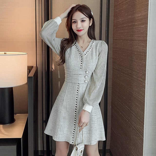 ラメ感たっぷりのレースの袖がゴージャスな印象を与えるドレスワンピース♪