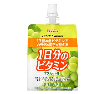 忙しく不規則な生活で食事が乱れがちな時など、十分に摂りきれないビタミン全13種を一度に摂ることができる「1日分のビタミンゼリー」のマスカット味です。みずみずしいゼリーの食感に、マスカットのすっきりとした甘さとほどよい酸味が楽しめるので、デザートや休憩時のおやつ代わりに、おいしく手軽にビタミンを補給できます。