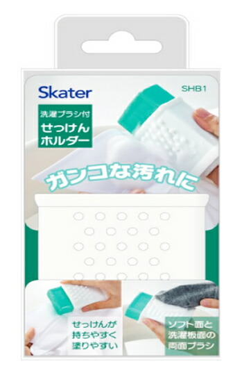 『スケーター 洗濯ブラシ付きせっけんホルダー 1個入』ありそうでなかった石けんホルダー◆滑りにくいから使いやすい石けんがすっぽり入るシリコーン製のホルダーなので、滑らずしっかり洗うことができます。手洗いでも汚れがしっかり落とせて、気持ちまでスッキリです。手洗い中に何度もツルっと滑って手から離れるストレスもありません。◆省スペースで保管も楽チンご家庭だとソープトレーで保管する方が多いと思いますが、スペースを取りませんか?また、石けんがついてベタベタのソープトレーは気持ちの良いものではありません。この石けんホルダーは自立するので使った後は立てて保管しておけば、スペースも取りませんし、ソープトレーのようにベタベタになることもありません。洗面台まわりの限られたスペースを有効活用できます。◆使いやすい長さに調整できるこのシリコーン製石けんホルダーは内側にいくつか引っ掛かりがある設計で、石けんを使いやすい長さで簡単に固定することができます。ちょっとしたことですが、快適に使えるということは面倒な家事のストレスを緩和し、スムーズにこなすことにつながります。◆衣服にやさしい2種類のブラシ石けんをこするだけでは汚れが落ちない時は外側の2種類のシリコーンブラシを試してみてください。細かい汚れは前面のソフトブラシで、ガンコな汚れは背面の洗濯板タイプのブラシがおすすめです。◆対応せっけんサイズ幅59×厚さ28mmI以下に対応※長さ75mm以下のせっけんをご使用の際は指等で底穴から押し出してください。※底穴から落ちるサイズでは固定しにくくなります。◆耐熱温度:230度※せっけんは付属しません。※素材の特性上、使いはじめはシリコーンゴム特有の臭いを感じる場合がありますが、徐々に弱まります。また、衛生上の心配はありません。