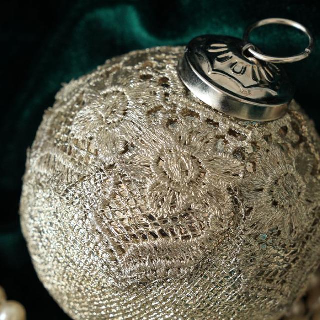ボールの表面にはアンティークレースのように繊細な装飾が施されていて、長い歳月を経てきたような古めかしさと温かみが感じられるアイテムです。