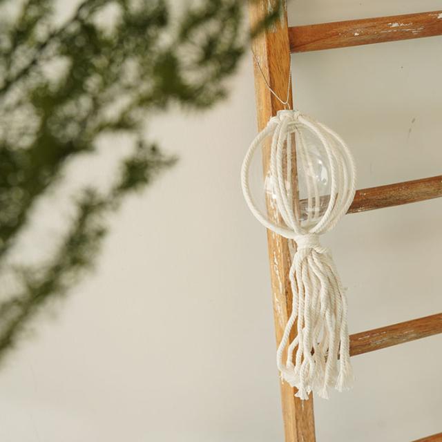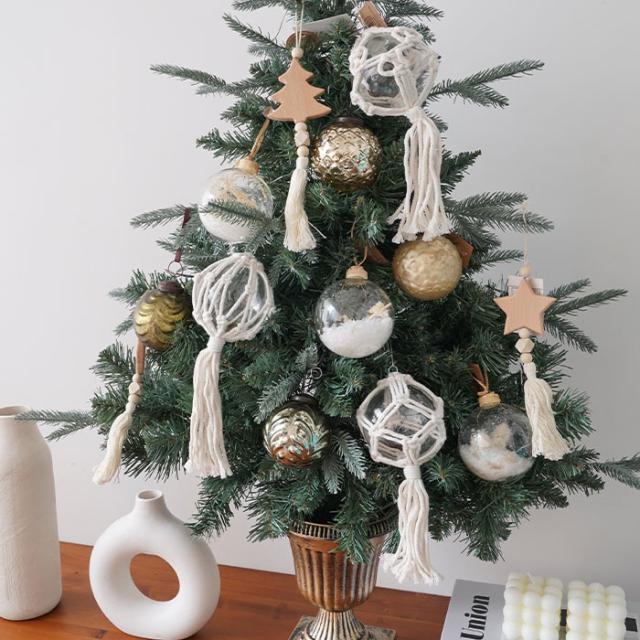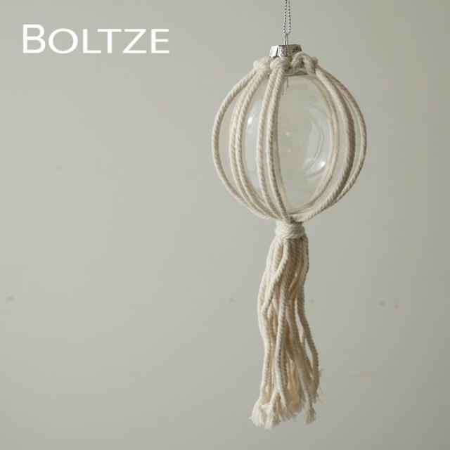 | ★ナチュラルな雰囲気で空間を癒してくれるガラスボールオーナメントです。 紐を手で編んで模様を生み出すマクラメ編みが目を引くお洒落なデザインです。丁寧に手結びされた組紐と透明なガラスボールの組み合わせが素材本来の自然な美しさを引き立てています。素材そのものの美しさを感じることができるアイテムです。 オーナメントは職人の手によって一つひとつ丁寧に作られたハンドメイド作品です。 クリスマスツリーに飾るのはもちろん、玄関先やシェルフに置いて飾ったり天井から吊るしたりと、楽しみ方の幅が広がるオーナメントです。 クリスマスシーズンだけでなく普段使いのインテリアとしても使える優秀なアイテムです。 サイズは高さが約22cmです。 |