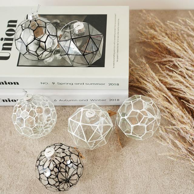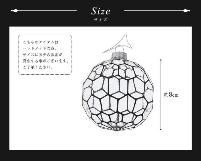 ★透明感のあるデザインが魅力のボールオーナメントです。 クリアガラスと幾何学模様の組み合わせがシンプルでスタイリッシュな印象を与えます。パッと目を引く幾何学模様はクリスマスツリーのアクセントにもぴったりです。程よい存在感で開放的な空間を演出してくれますよ。 モノトーンやモダンインテリアが好きな方におすすめのアイテムです。 オーナメントは職人の手によって一つひとつ丁寧に作られたハンドメイド作品です。 クリスマスツリーに飾るのはもちろん、玄関先やシェルフに置いて飾ったり天井から吊るしたりと、楽しみ方の幅が広がるオーナメントです。 クリスマスシーズンだけでなく普段使いのインテリアとしても使える優秀なアイテムです。 標準サイズの8cmボールです。 |