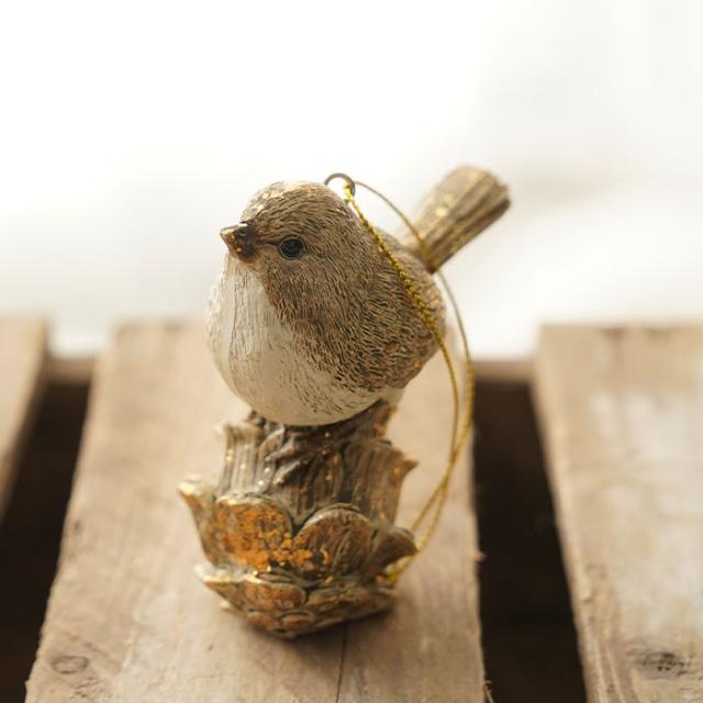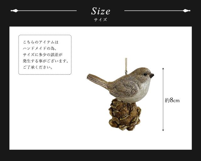 | ★松ぼっくりの上にとまり静かに羽を休める小鳥。大きくてまん丸の黒い瞳がとても印象的です。 可愛らしいイメージが強い動物モチーフのオーナメントですが、シックな色味にすることで落ち着きのある大人っぽい雰囲気に仕上げています。 どこか懐かしさも感じられるオーナメントです。 季節を問わないデザインなので、クリスマスシーズン以外でも日常のインテリアとしてお楽しみいただけます。 サイズは高さが約8cmです。 |