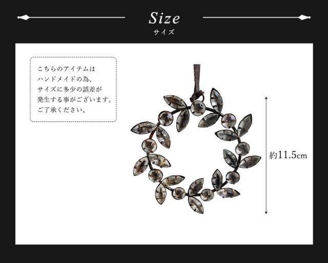 | ★シンプルなデザインのリーフハンガーオーナメント。 まるで月桂樹のリースのように空間を優しく包み込んでくれます。 ゆらゆらと揺れるたびに光の反射でラインストーンがきらきらと輝きます。フレームには錆びたような塗装が施されていて、長い年月をかけて受け継がれてきたかのようなアンティークな雰囲気も感じさせてくれます。 季節を問わないデザインなので、クリスマスシーズン以外でも日常のインテリアとしてお楽しみいただけます。 高さは約11.5cmです。 |