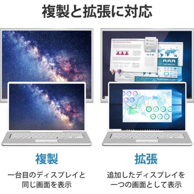 ■追加したディスプレイを一つの画面として表示するマルチディスプレイと、一台目のディスプレイと同じ画面を表示するミラーリングに対応しています。