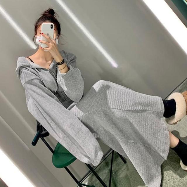 ふんわりパーカーにスッキリマーメイドスカートのコーデュロイのセット。