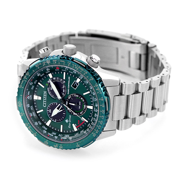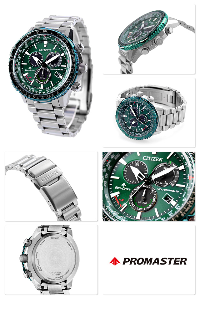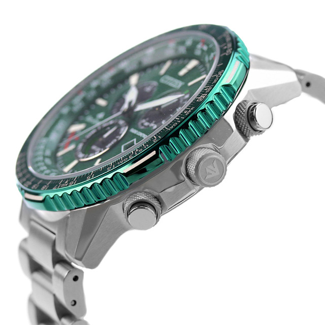 正規品 7年保証キャンペーン 送料無料 シチズン プロマスター エコ・ドライブ電波時計 ダイレクトフライト SKYシリーズ クロノグラフ 電波ソーラー エコドライブ電波 メンズ 腕時計 CB5004-59W CITIZEN PROMASTER SKY Eco-Drive アナログ グリーン ◆機能性、耐久性、安全性を兼ね備えた本格スポーツウオッチ、シチズン PROMASTER(プロマスター)。SKYシリーズの人気ラインから、空の色にインスパイアされた3アイテムが登場。一面に広がるオーロラを連想させるグリーンのベゼル。文字板にも人気のグリーンを採用した一体感のあるデザインです。ベゼルカラーの特徴を最大限活かすため、あえてベゼル部分にはインク色を入れず、全体をバランスよく仕上げています。カジュアルスタイルにはもちろん、ジャケットやコートにも合わせやすくシーンを問わずお使いいただけます。 発売日:22年11月発売