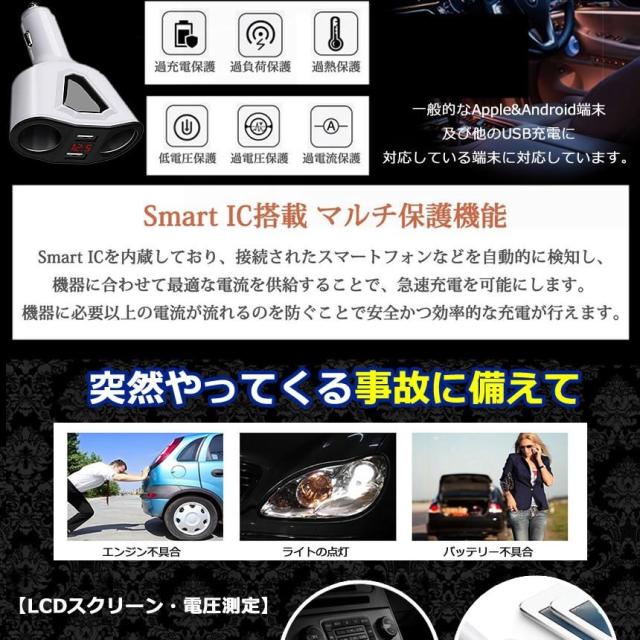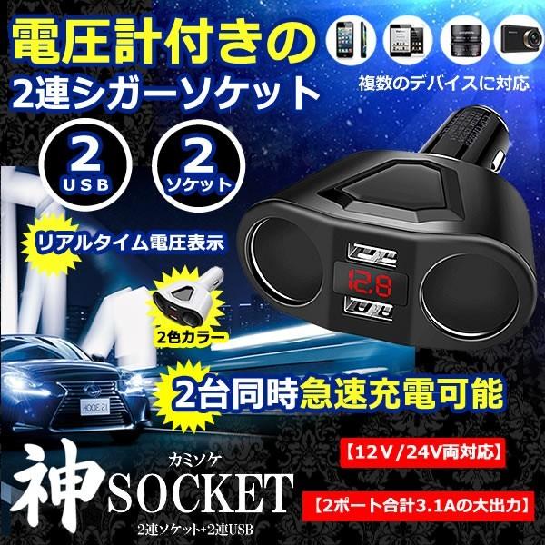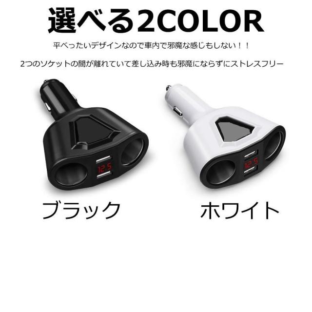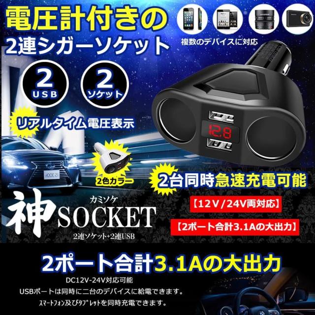 2連 シガーソケット 分配器 増設 ソケット 2口 USB スマホ iphone タブレット 急速 充電 3.1A 120W ブラック ホワイト 電圧計 バッテリーチェッカー KAMISOCKET
