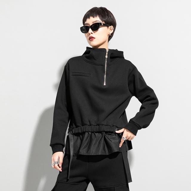 プルオーバー パーカー レディース トップス 長袖 モード系 個性的 フェイクツーピース 大人 おしゃれ 黒 きれいめ ゆったり 韓国ファッション 春秋