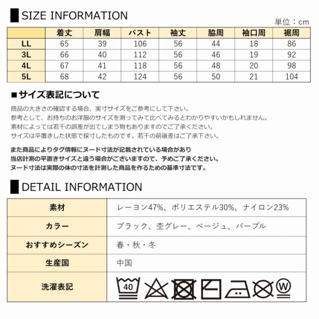 4L:着丈67 肩幅41 バスト118 袖丈56 脇周48 袖口周20 裾周98