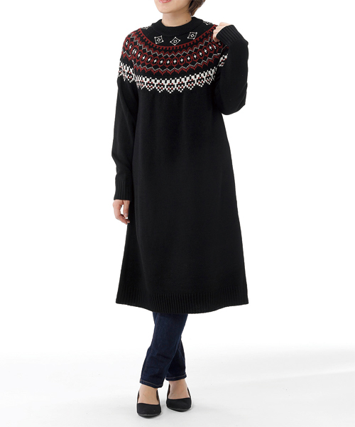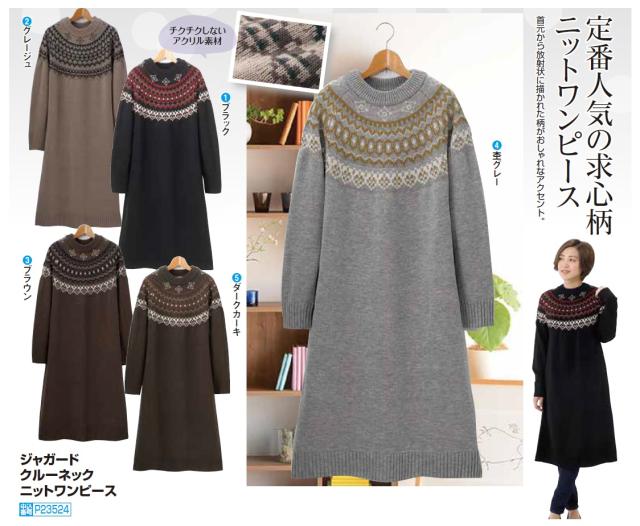 sale ワンピース 秋冬 ジャガードクルーネックニットワンピース 全5色 Aライン 長袖 セーター ブラック グレージュ ブラウン グレー カーキ レディース 婦人服 ミセス シニア 女性 丸首 ノルディック ファッション 50代 60代 70代 80代 spi p23524 p25479 p25579