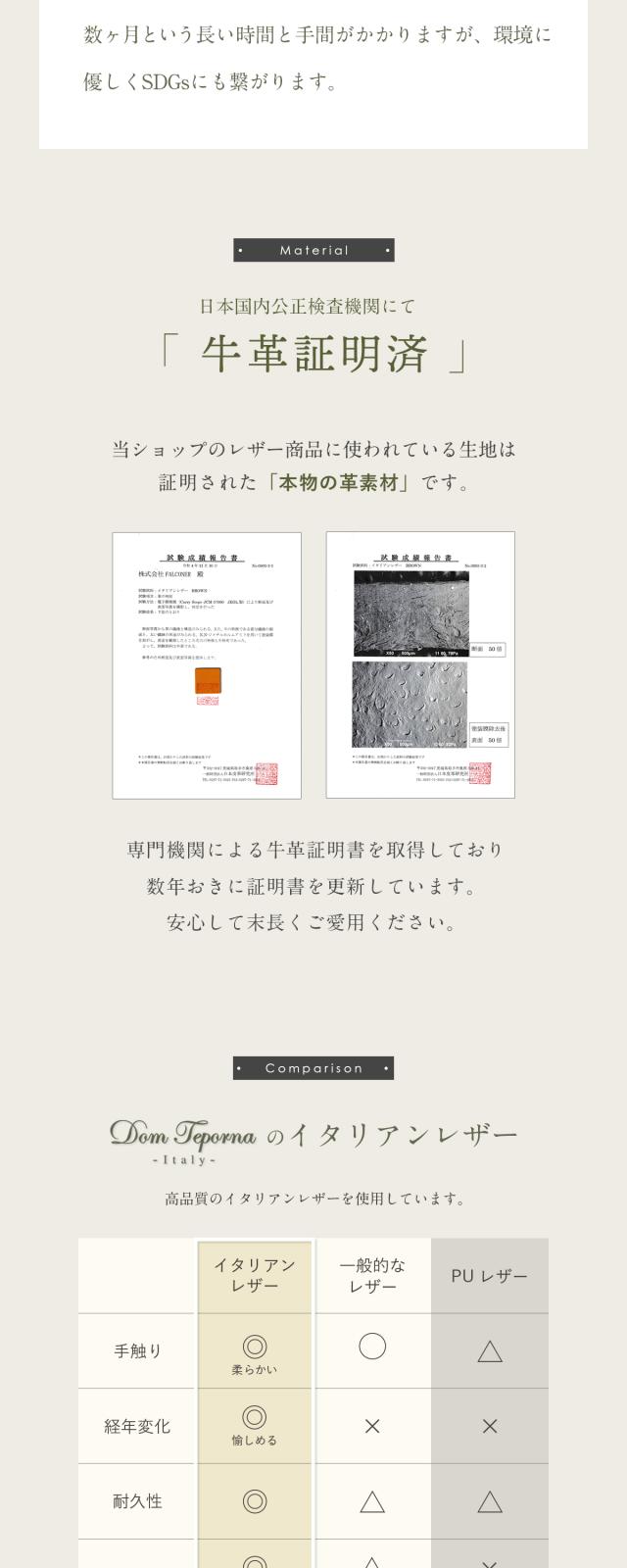 表側は柔らかいイタリアンレザーを贅沢に使用しています。使うごとに変化する風合いを楽しめるのは本革ならではの魅力。内側には耐久性に優れた高品質マイクロファイバーを採用し、長くご愛用いただけます。