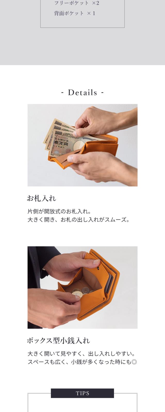 アクセスしやすいボックス型小銭入れと大きく開くお札入れで、支払いもスマートに。背面ポケットは駐車券や領収証などの一時保管に便利。