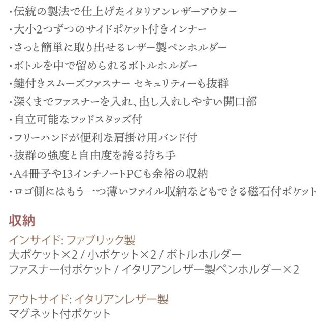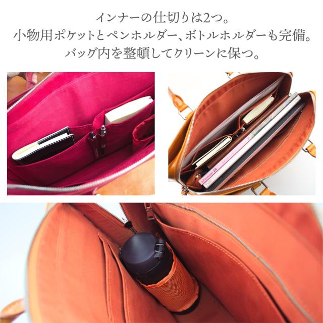 インナーには大小4つのポケットにペンホルダー、ボトルホルダーなど完備。大切なものを守るファスナー付きポケットも便利です。