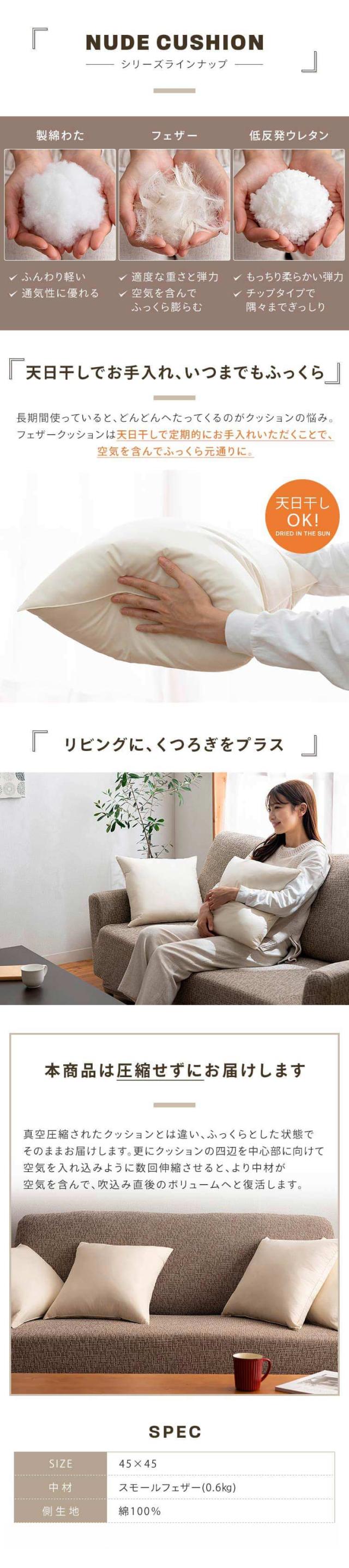 クッション フェザーヌードクッション 生成り 10106 中身 フェザー 背当て 45角 インテリア スモールフェザー 45×45 ヌードクッション 【int】
