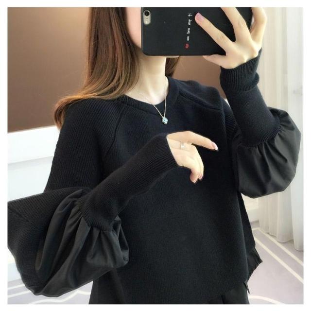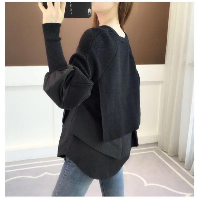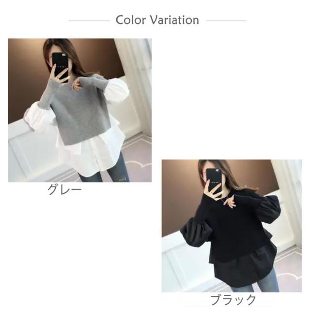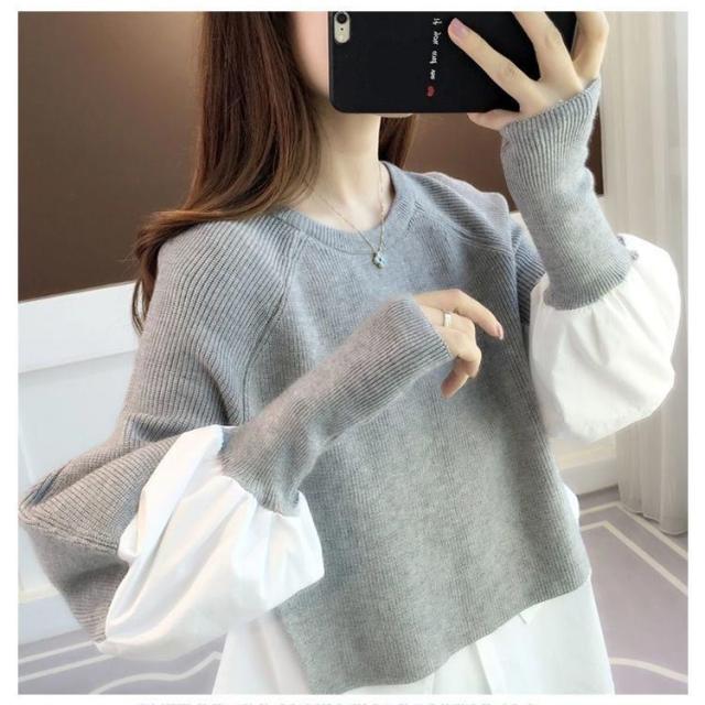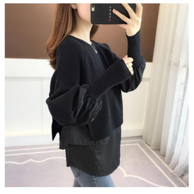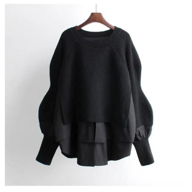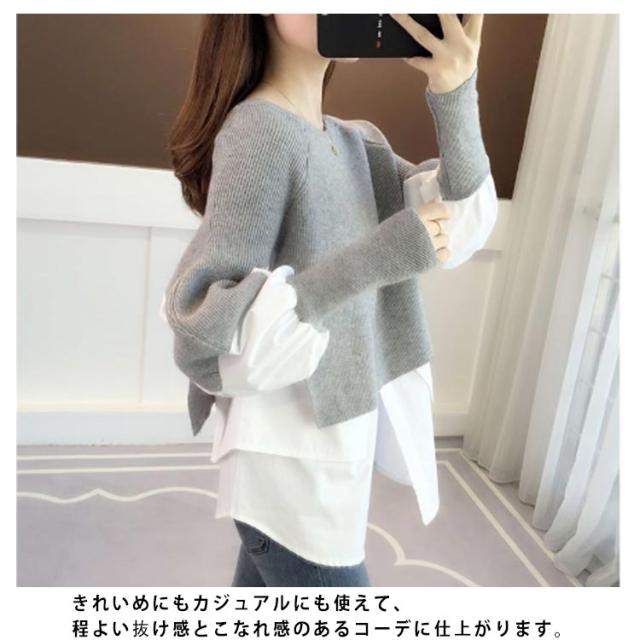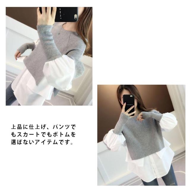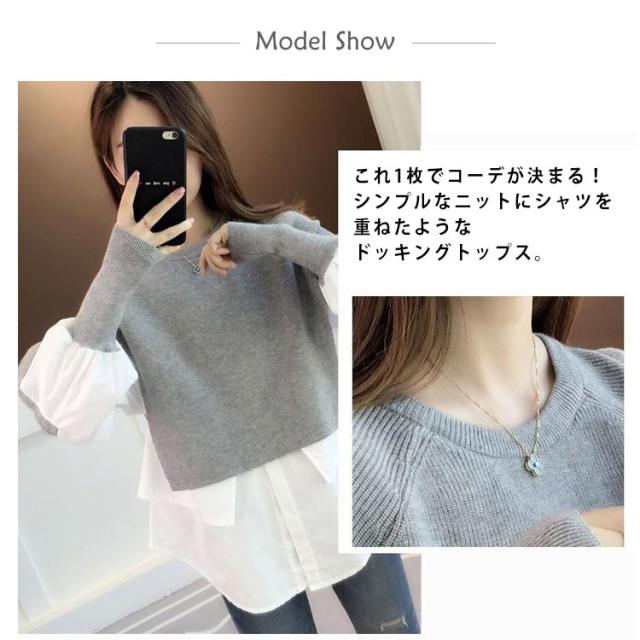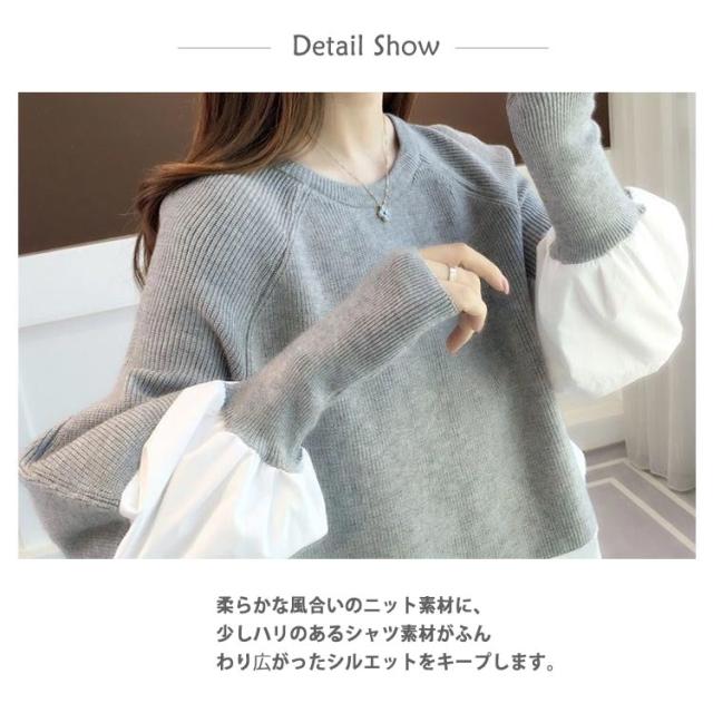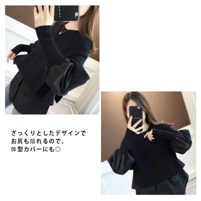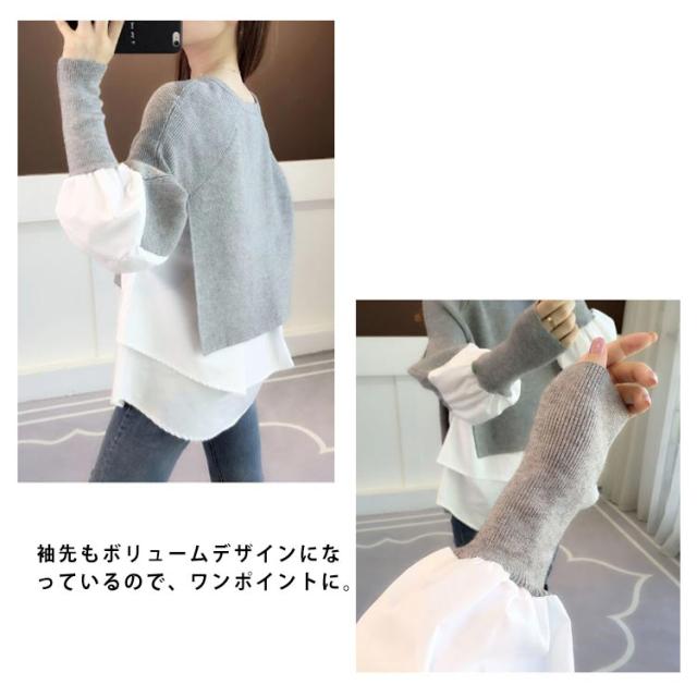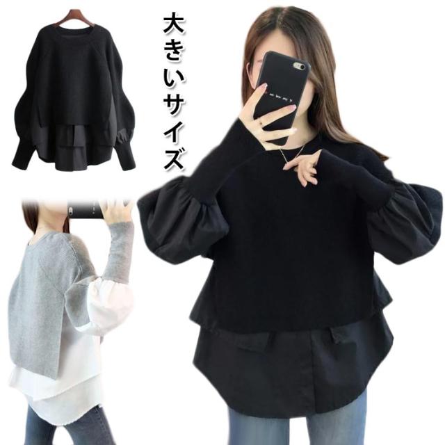 送料無料 ドッキング セーター ニット シャツ ブラウス 長袖 ボリューム袖 クルーネック チュニック レディース トップス ドッキングニット 無地 長袖 異素材 重ね着風 レイヤード ゆったり 大きいサイズ 体型カバー 大人可愛い トップス