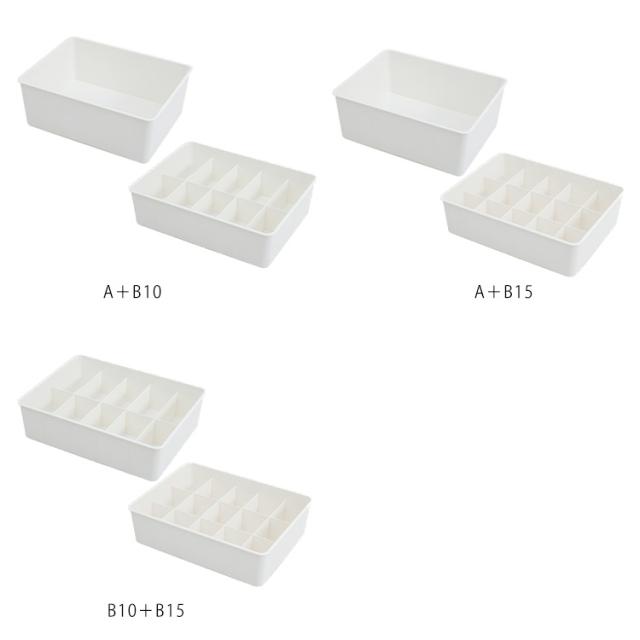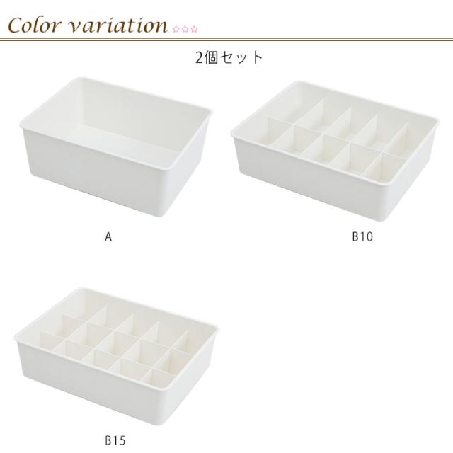 | 取りやすくて見た目もキレイに!フタ付き下着収納ボックス2個セット 安心なフタ付きでホコリも入らず安心♪ 積み重ねもできて、引き出し以外でも収納できます。 汚れたら水洗いもできてる便利なプラスチック製、耐摩耗性にも優れています。 15仕切りタイプは下着類、10仕切りタイプにはソックス類、仕切りなしタイプはブラジャーなど用途に合わせて組み合わせ可能です。 | |