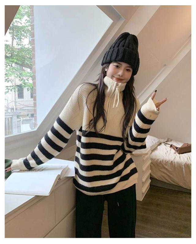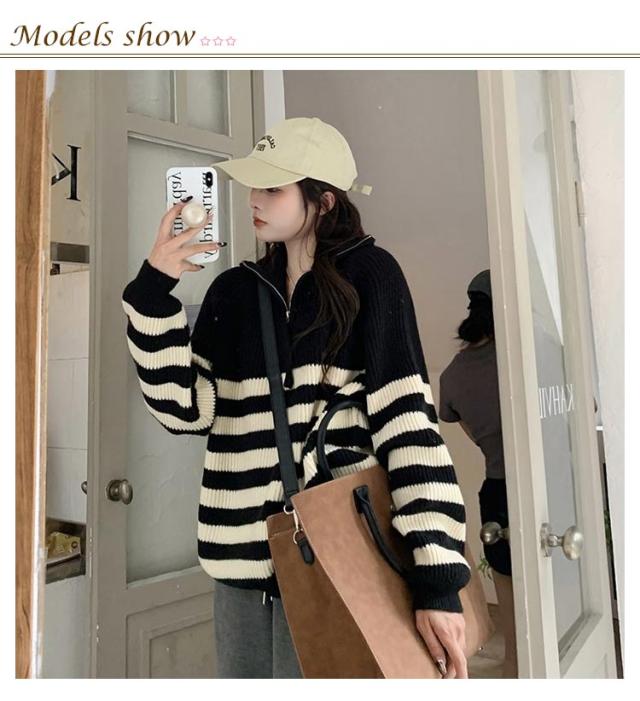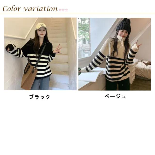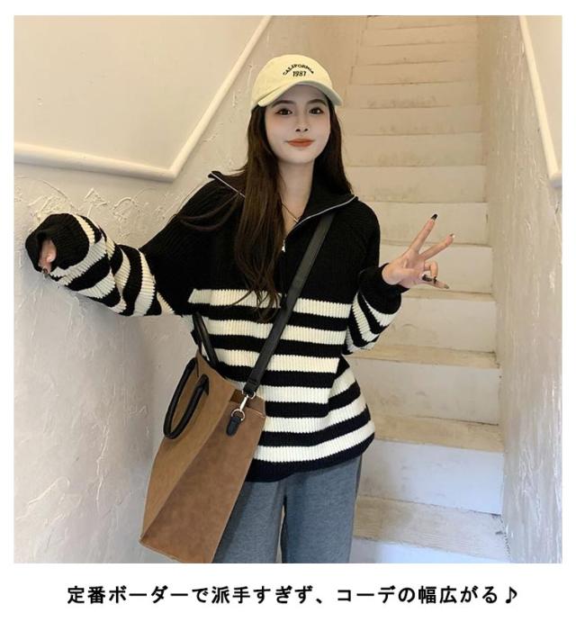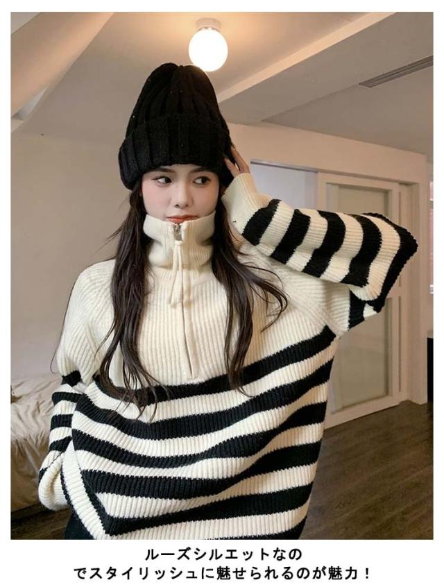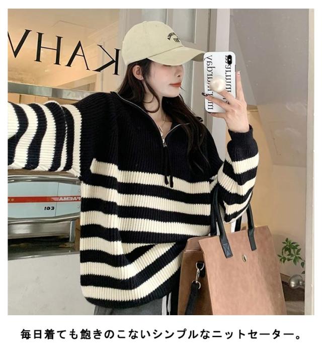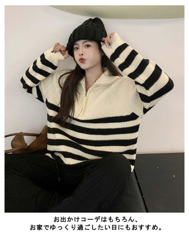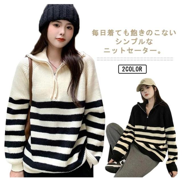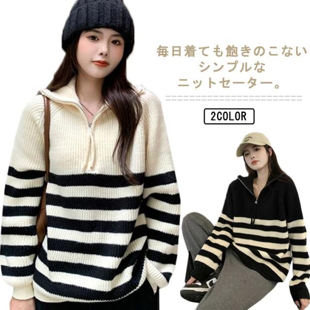 ニット レディース ジップアップ ゆったり ボーダー 体型カバー 可愛い カジュアル リブ ニットセーター トップス おしゃれ 通勤 通学 秋冬 プルオーバー 普段着 フェミニン 送料無料