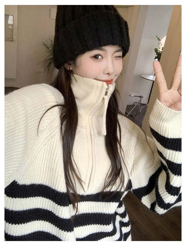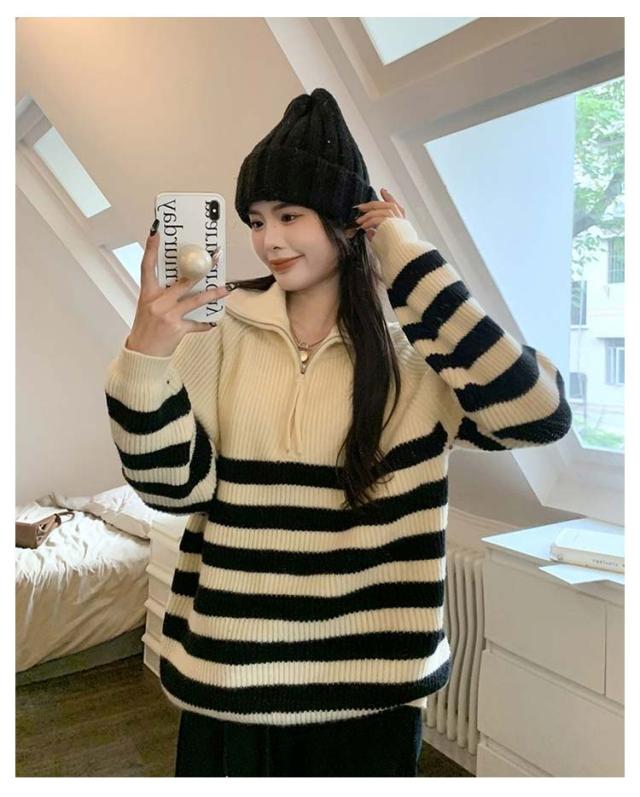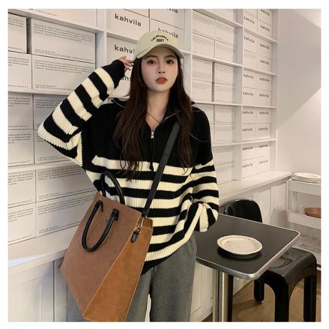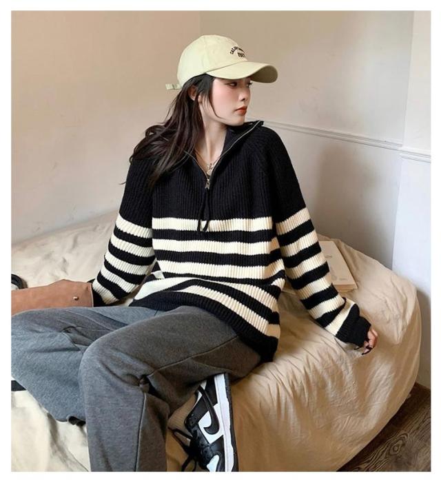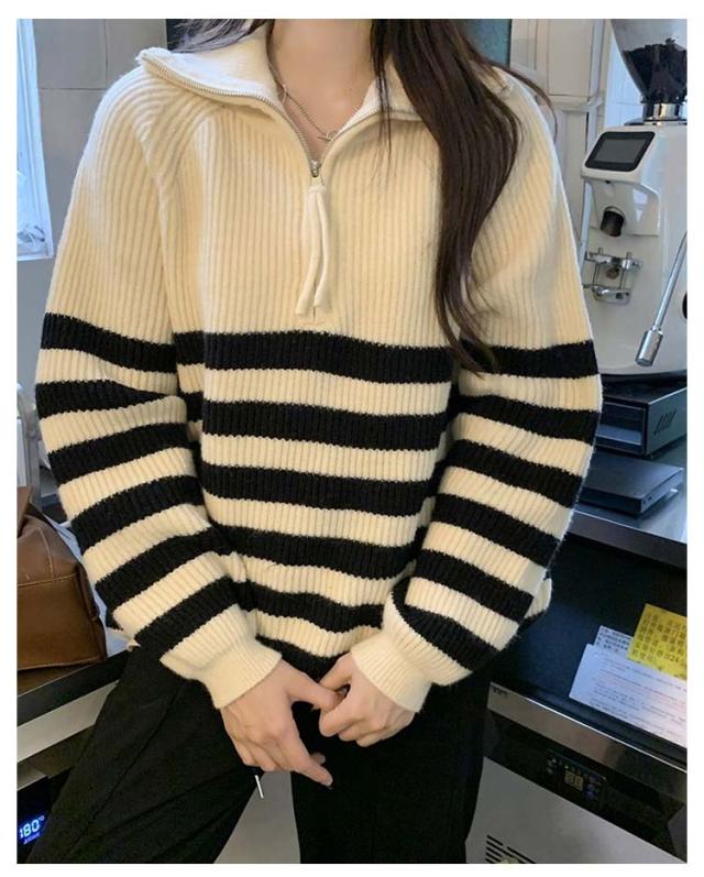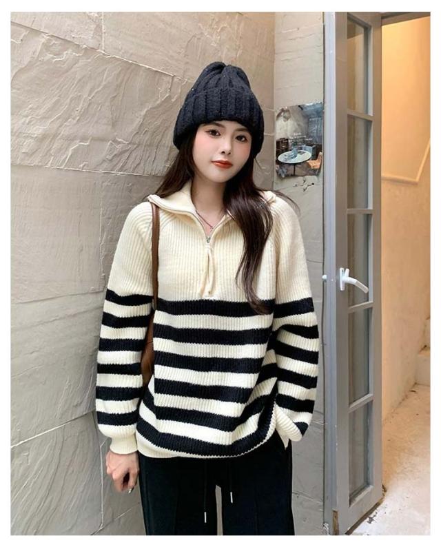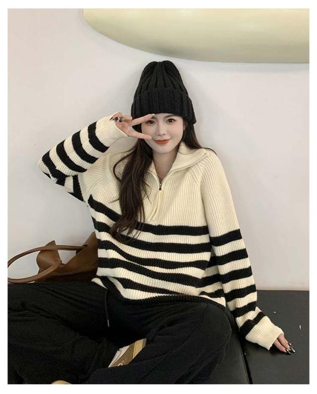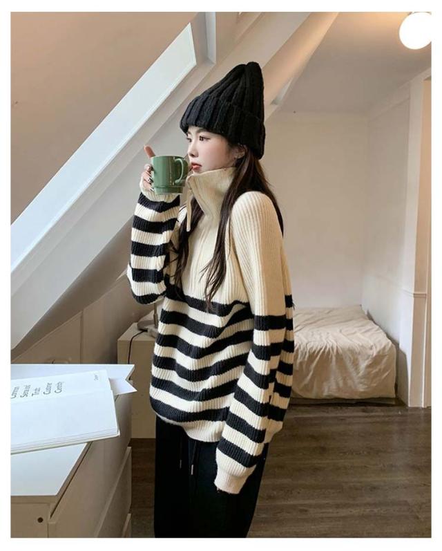 ニット レディース ジップアップ ゆったり ボーダー 体型カバー 可愛い カジュアル リブ ニットセーター トップス おしゃれ 通勤 通学 秋冬 プルオーバー 普段着 フェミニン 送料無料