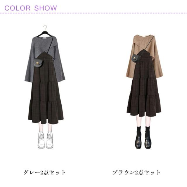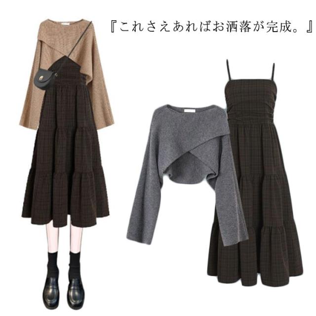 ニット ニットセーター セットアップ レディース 2点セット 長袖 ワンピース クロス ニットトップス フレアワンピース キャミソールワンピース Aライン ロングワンピース ミモレ丈 レイヤード風 重ね着風 大人 通学 通勤 カジュアル オフィス 春秋