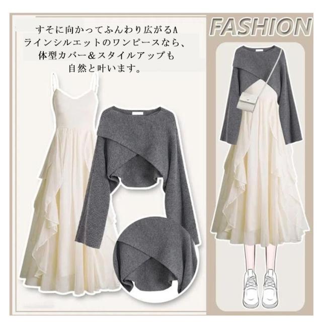 ニット セットアップ レディース ニットセーター 長袖 ワンピース 2点セット クロス ニットトップス フレアロングワンピース 上下セット Aラインワンピース ミモレ丈 レイヤード風 重ね着風 大人 通学 通勤 カジュアル オフィス