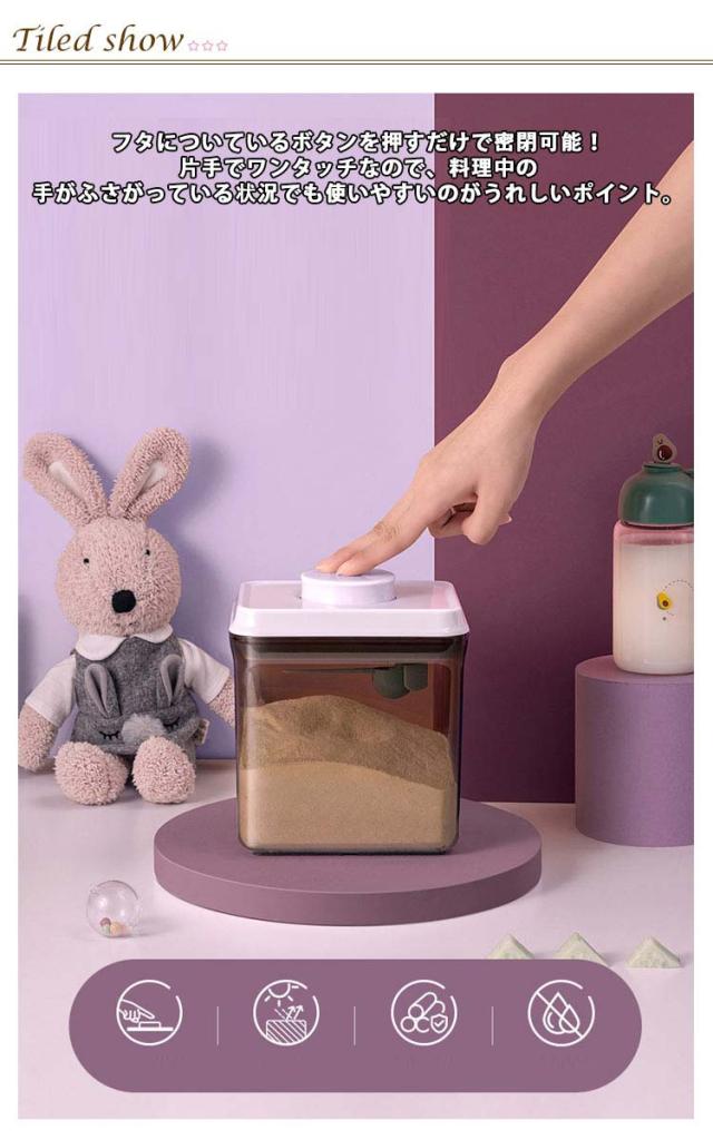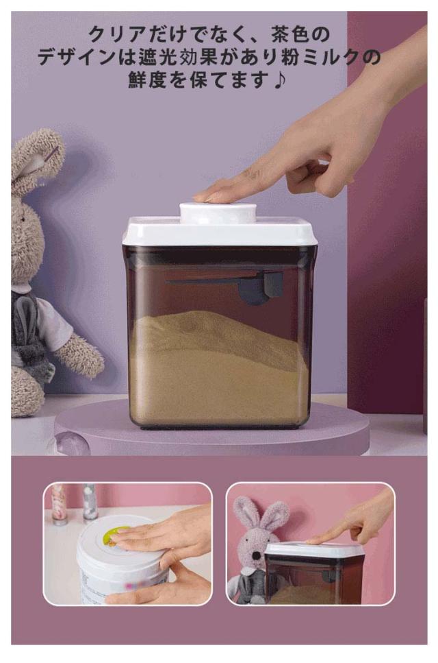 | 粉ミルクやプロテインの長期保存に最適な容器 フタについているボタンを押すだけで密閉可能!片手でワンタッチなので、料理中の手がふさがっている状況でも使いやすいのがうれしいポイント。 クリアだけでなく、茶色のデザインは遮光効果があり粉ミルクの鮮度を保てます♪ フタ部分はスプーン収納所があり、サイズ違いスプーンにも対応できます。 コンパクトなサイズ、外遊びや旅行に大変便利なアイテムです。 粉ミルクだけでなく、米やナッツなどの保存容器としてもおすすめ。 | |