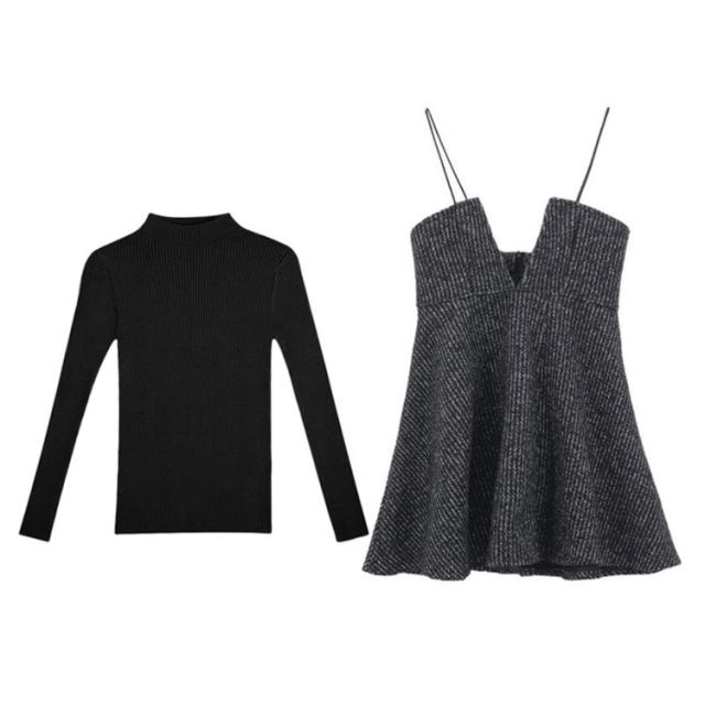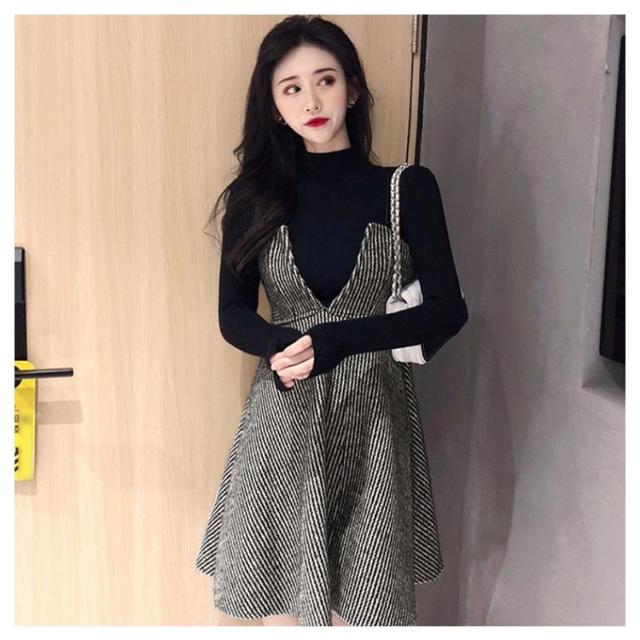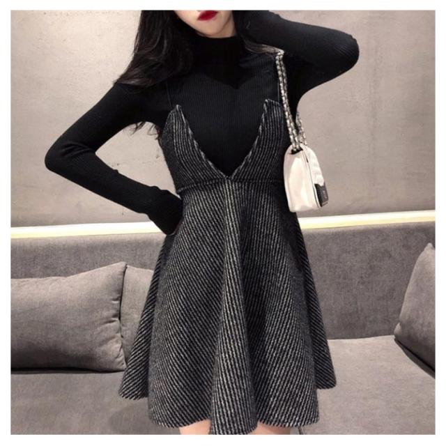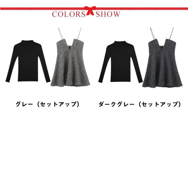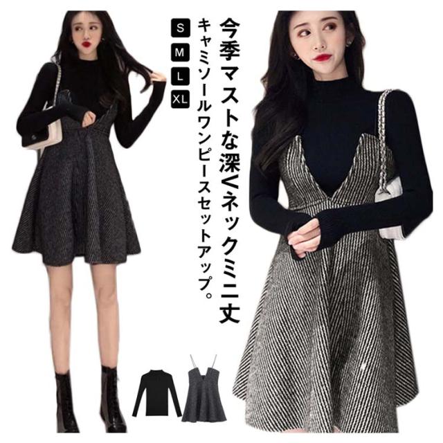 ワンピース セットアップ キャミソール ワンピース 深めVネック レディース Aライン ワンピ ミニ丈 ツイード ブラウス 長袖 メロウ 大人可愛い ミニワンピース ストライプ柄 着痩せ 春秋 通勤 普段着 パーティー お呼ばれ