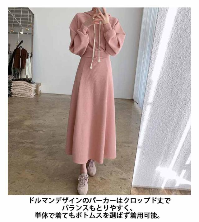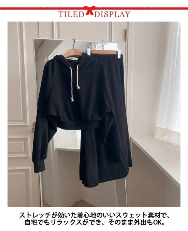 | ショート丈パーカーとマキシ丈フレアスカートのスウェットセットアップ。 ドルマンデザインのパーカーはクロップド丈でバランスもとりやすく、単体で着てもボトムスを選ばず着用可能。 ふわっと広がるAラインスカートはシルエットが美しくきれいめな印象に。 ストレッチが効いた着心地のいいスウェット素材で、自宅でもリラックスができ、そのまま外出もOK。 ゆったりとカジュアルにおうち時間のルームウェアにもぴったりなセットアップ◎ | |