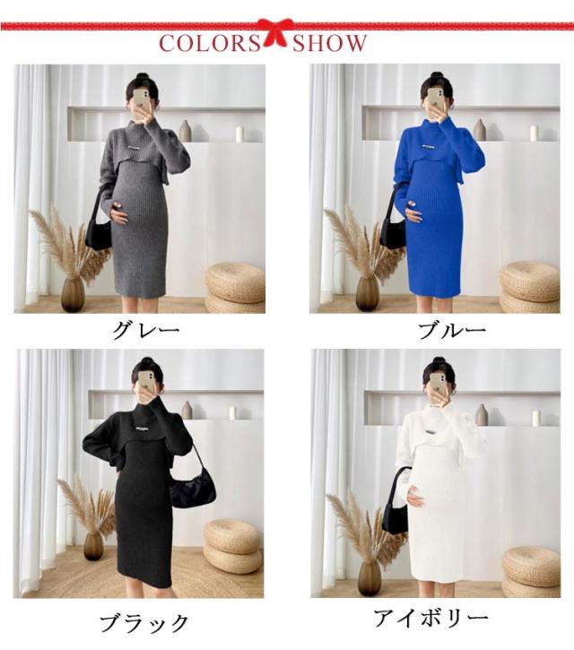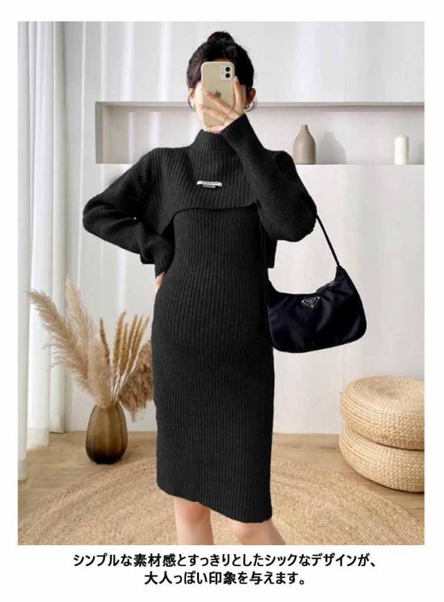 ニット セットアップ マタニティ ニットトップス 長袖 ワンピース 2点セット ニットセーター ハイネック タイトワンピース 膝丈 妊婦服 産前 産後 リブニット プルオーバー レイヤード風 重ね着風 セット 【送料無料】