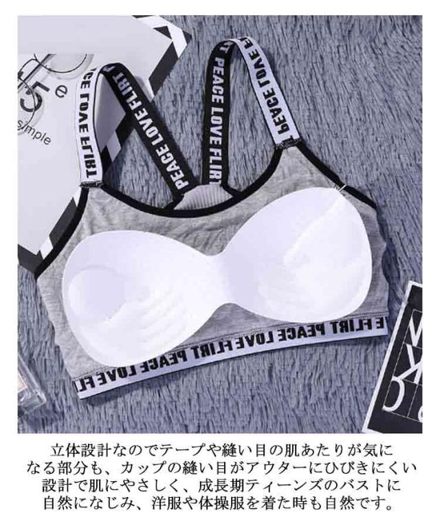 | 大人の女性にもリラックスタイムやスポーツシーンにも最適です! スポーツ系クラブ活動女子にオススメのスポーツブラです!中学生・高校生の運動シーンに最適!部活だけではなく、体育や文化系女子、どんどん大人の女性に近づいている小学生の女の子にも! 細すぎず太すぎないストラップが動きに密着し、アンダーの太めのゴムにより激しい運動でもズレにくく、ピタッと身体の動きにフィットします! ズレにくいY字バック設計。肩ヒモも気にならないスポーツブラだから気にせず腕を動かせるので、ガールズの部活動・スクールライフを下着で応援します。 立体設計なのでテープや縫い目の肌あたりが気になる部分も、カップの縫い目がアウターにひびきにくい設計で肌にやさしく、成長期ティーンズのバストに自然になじみ、洋服や体操服を着た時も自然です。 | |