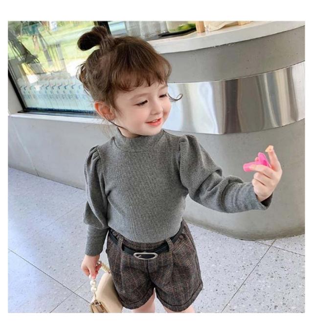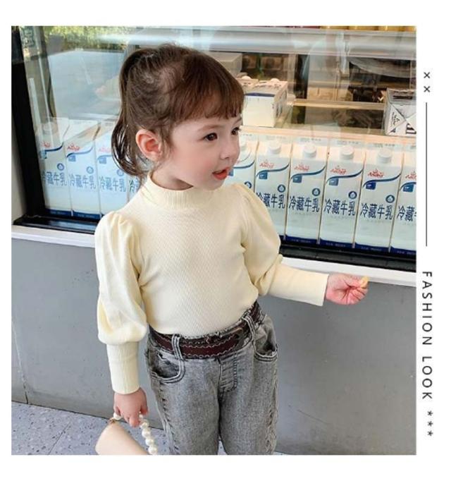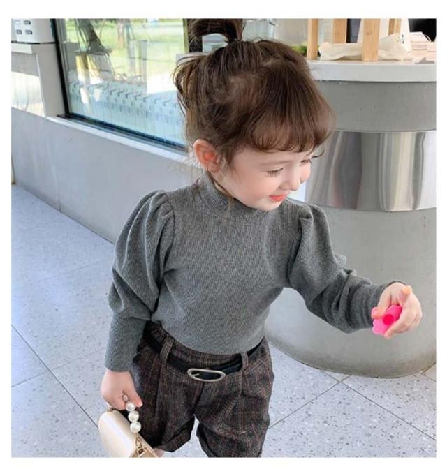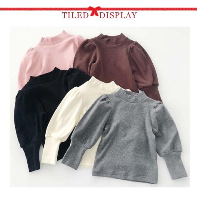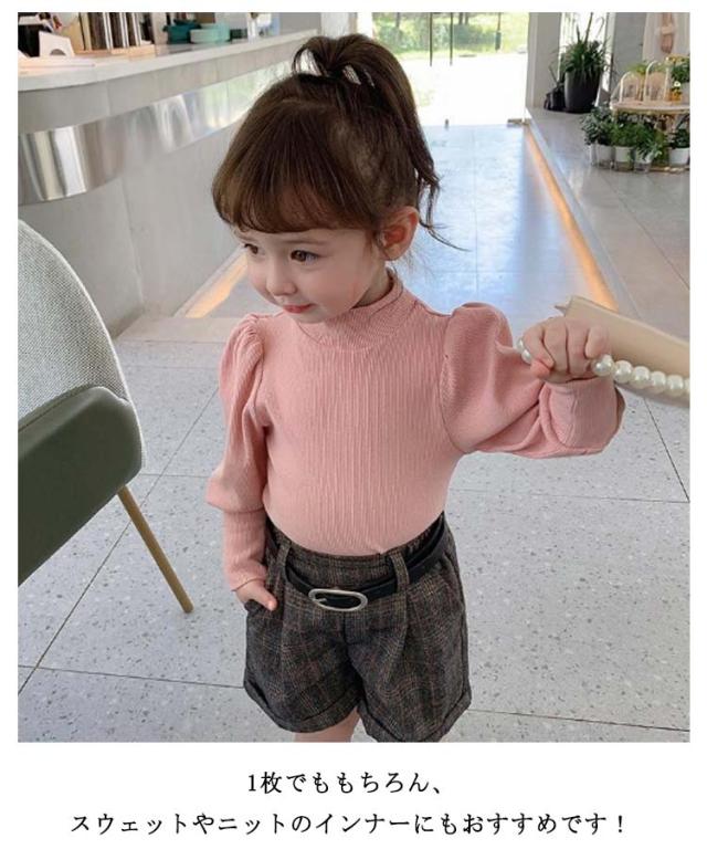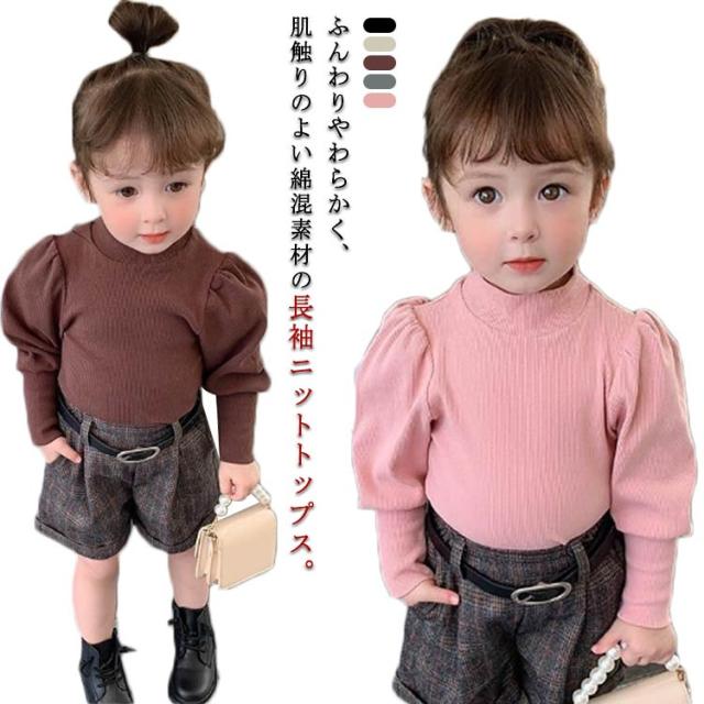 キッズ ニット プルオーバー 長袖 ニットトップス タートルネック 子供服 女の子 ニットセーター スリム 細身 パフ袖 ボリュームスリーブ 無地 薄手 リブニット 80 90 100 110 120 130 140 可愛い おしゃれ 【送料無料】