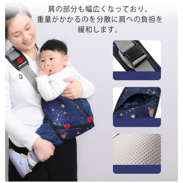 | 歩き始めたお子様とお出かけする時に便利な片手抱っこひも! 肩にかけるだけ!広めの座面で赤ちゃんのお尻から背中までサポートしてます。 肩の部分も幅広くなっており、重量がかかるのを分散に肩への負担を緩和します。 ベルト裏には、滑り止めがついているので、ずり落ちの心配もありません。 撥水加工済なので、雪や雨のほか、飲みこぼしや食べこぼしてもお手入れ簡単♪ 軽くて折りたたむとコンパクトなので、持ち運びに便利! | |