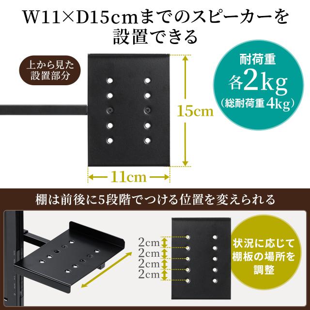 ●設置できるスピーカーは、2kgまでで幅11cm×奥行15cmまでに対応しています。