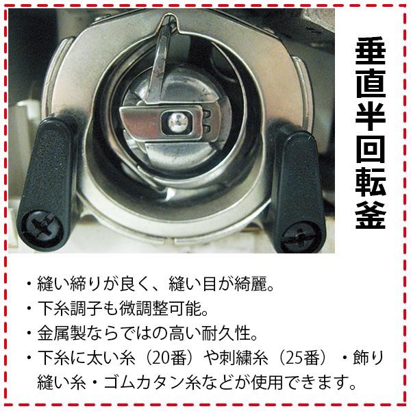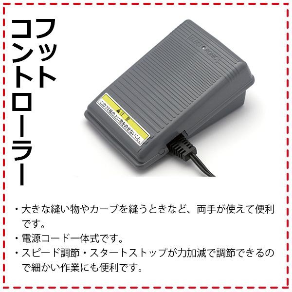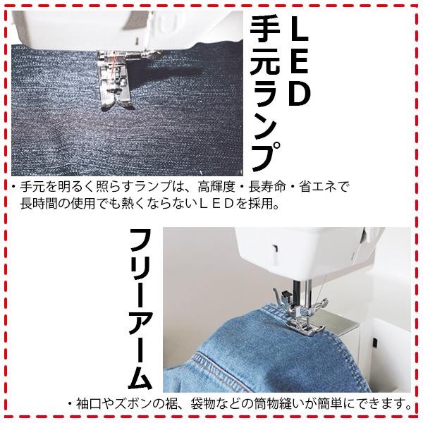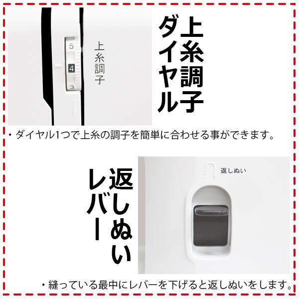 | 付属品 | ジグザグ押え、ファスナー押え、ボタンホール押え、送りカバープレート、ドライバー、ブラシ付きリッパー、糸こま座×2、針パック、ボビン×4(1個は本体に装着)、ソフトカバー、電源コード・フットコントローラー(一体型)、取扱説明書(DVD付)、保証書(1年間) |