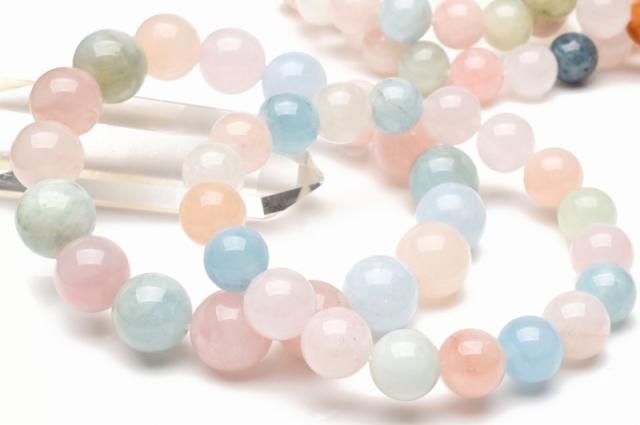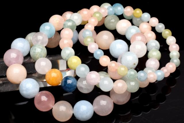 | 特徴・意味 | パルテルカラーが可愛らしく上品なブレスレットです。 中にはヘリオドールやブルーカラーが含まれている場合もございます。 ベリルは、緑柱石をあらわすグループの総称。含まれる鉱物によって発色が異なり、それぞれ違った名前を持っています。中でも鉄分を含んで青くなったものはアクアマリン、クロムの作用によって緑色になったものはエメラルド、マンガンを含んでピンク色になったものはモルガナイトと呼ばれています。 ベリルのうち、透明度の高いものは希少価値がとても高く、宝石としても扱われます。古代クレオパトラの時代にも、装飾品として愛用されていたことが伝えられており、人気の高いパワーストーンの一つです。 ヒーリング作用が強く、心を癒して持ち主に富と名誉をもたらすと伝えられる「ベリル」。アクアマリンやエメラルドの他、ピンク色のモルガナイトや黄色のゴールデンベリルなど、さまざまな鉱物が含まれており、それらがすべてベリルと呼ばれています。 |